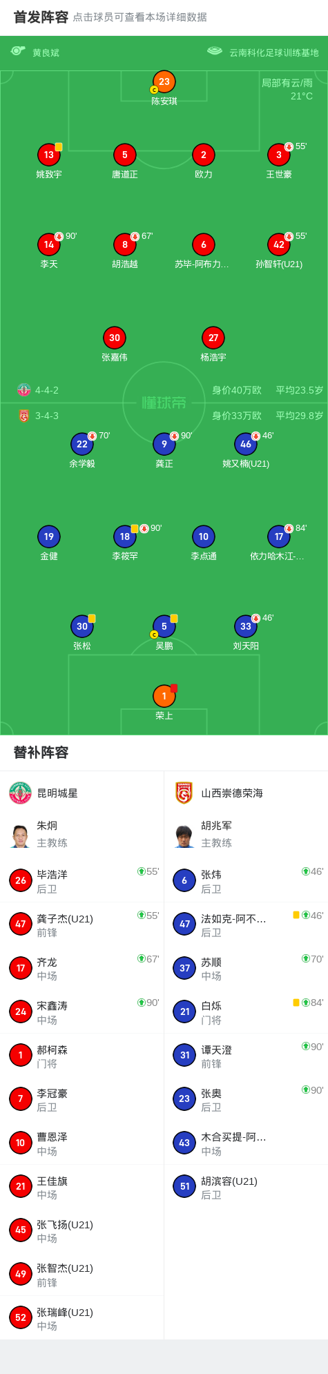北京时间8月31日中国足球乙级联赛 决赛阶段保级组 第24轮,昆明城星主场对阵山西崇德荣海。最终比分昆明城星 0-0 山西崇德荣海。精彩瞬间第79分钟,山西崇德荣海球队荣上吃到红牌。球队阵容...